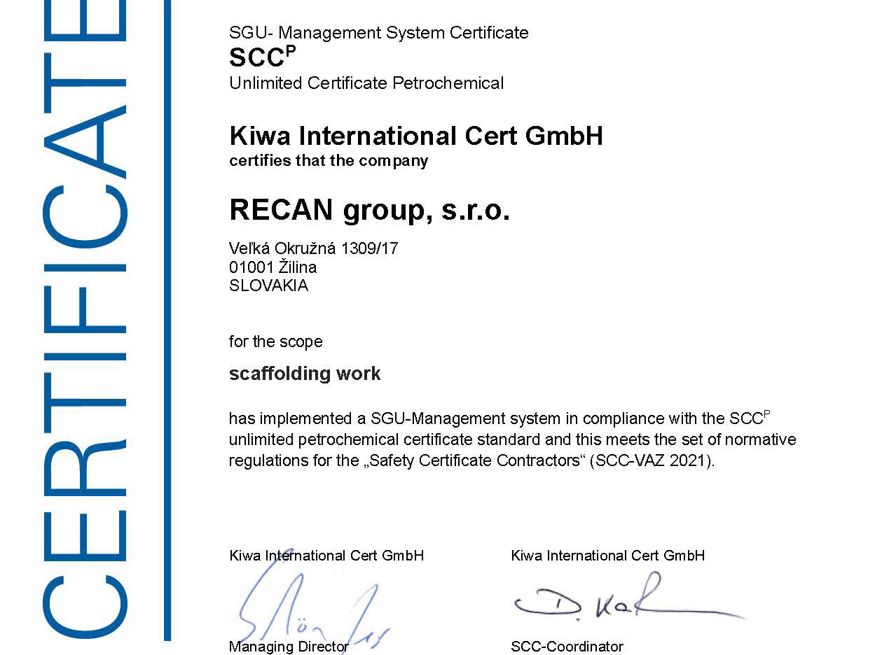 Scroll dowUnser Unternehmen besitzt das internationale SCC-P-Zertifikat (Safety Certificate Contractors – Petrochemical), das von Kiwa ausgestellt wurde. Dieses Zertifikat steht für einen hohen Standard in den Bereichen Sicherheit, Gesundheitsschutz und Umweltschutz, insbesondere im risikoreichen Umfeld der petrochemischen Industrie.SCC-P ist die höchste Zertifizierungsstufe im SCC-System und richtet sich an Unternehmen, die risikoreiche Tätigkeiten ausführen – wie z. B. Gerüstbau, Montage, Demontage, Wartung oder technische Installationen in Industrie- und Chemieanlagen.Der Erwerb dieses Zertifikats bestätigt unsere fachliche Kompetenz, unseren systematischen HSE-Ansatz sowie die vollständige Einhaltung aller geltenden gesetzlichen Anforderungen.Dank unserer SCC-P-Zertifizierung sind wir umfassend qualifiziert, Projekte unter anspruchsvollen industriellen Bedingungen sicher und professionell in der gesamten Europäischen Union durchzuführen.n to see more